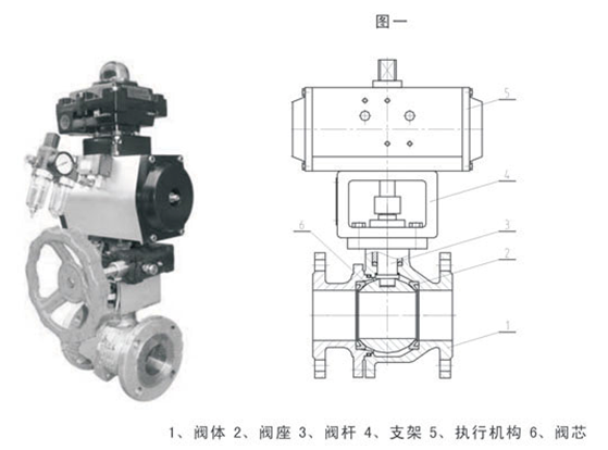 氣動O型切斷球閥是由O型球閥、氣缸式執行機構兩大部分及電器元件組成,如圖一所示,氣缸式執行機構是O型球閥的驅動裝置,當壓縮氣體通過電磁閥或其他控制器進入氣缸一端,推動活塞移動,通過活塞桿、曲柄、立軸等傳動機構,使球芯以立軸為中心旋轉90°,使球閥由開(或關)的狀態變為關(或開)的狀態。達到對管道內介質的自動控制。